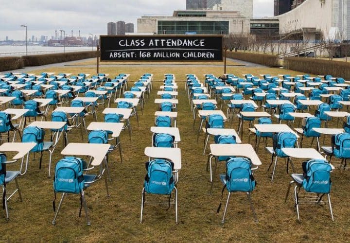 « Cette salle de classe représente les millions de lieux d’apprentissage qui restent vides – beaucoup depuis presque une année entière. Au dos de chaque chaise vide se trouve un sac à dos vide – qui incarne la mise en suspens du potentiel d’un enfant », explique Henrietta Fore. « Nous ne voulons pas que les portes closes et les bâtiments fermés masquent le fait que l’avenir de nos enfants est indéfiniment mis en mode « pause ». Cette installation est un message aux gouvernements : nous devons accorder la priorité à la réouverture des écoles et nous devons tout faire pour qu’elles rouvrent en meilleur état qu’avant. »
